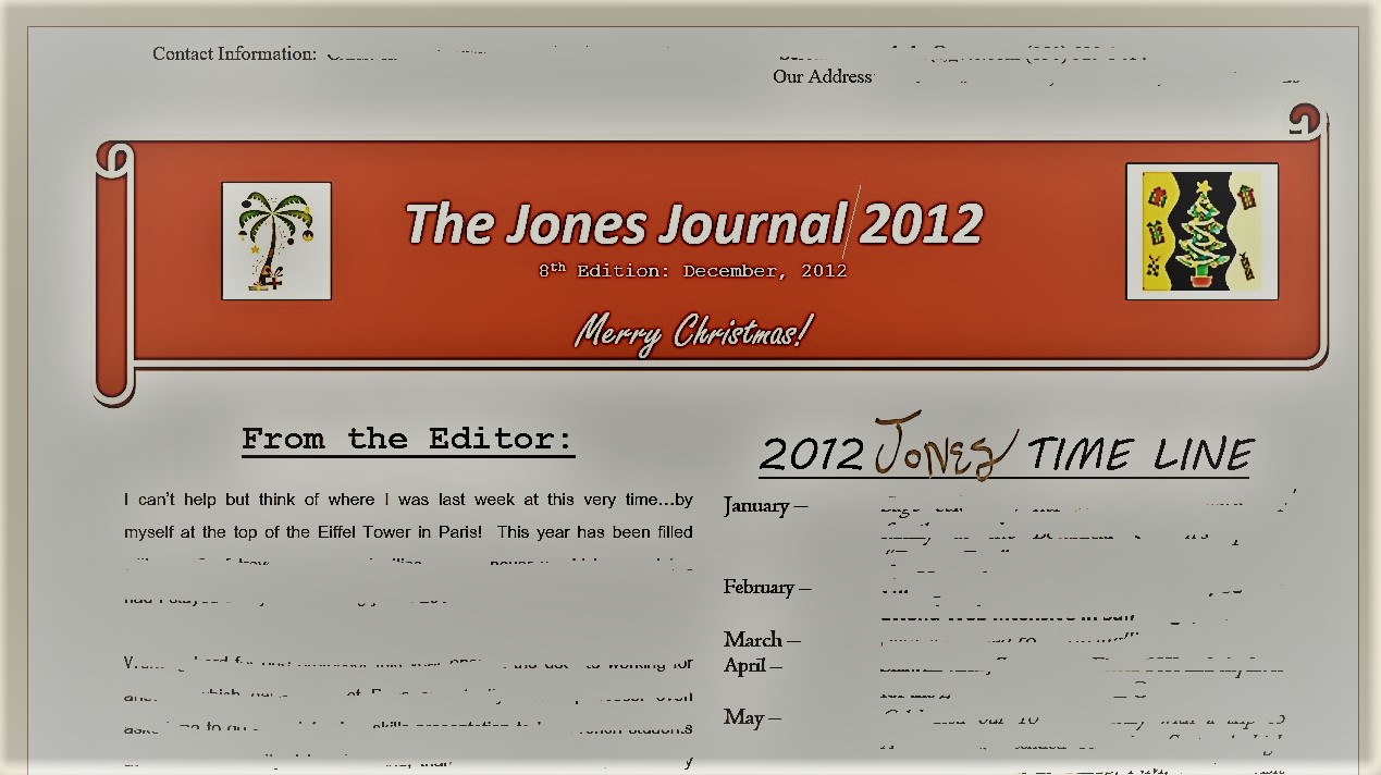 Usually, after I finish with the current year’s Christmas letter, I save the file again with the next years date. Then I erase all that stuff and add new starting with the timeline (read #1 above about the timeline).